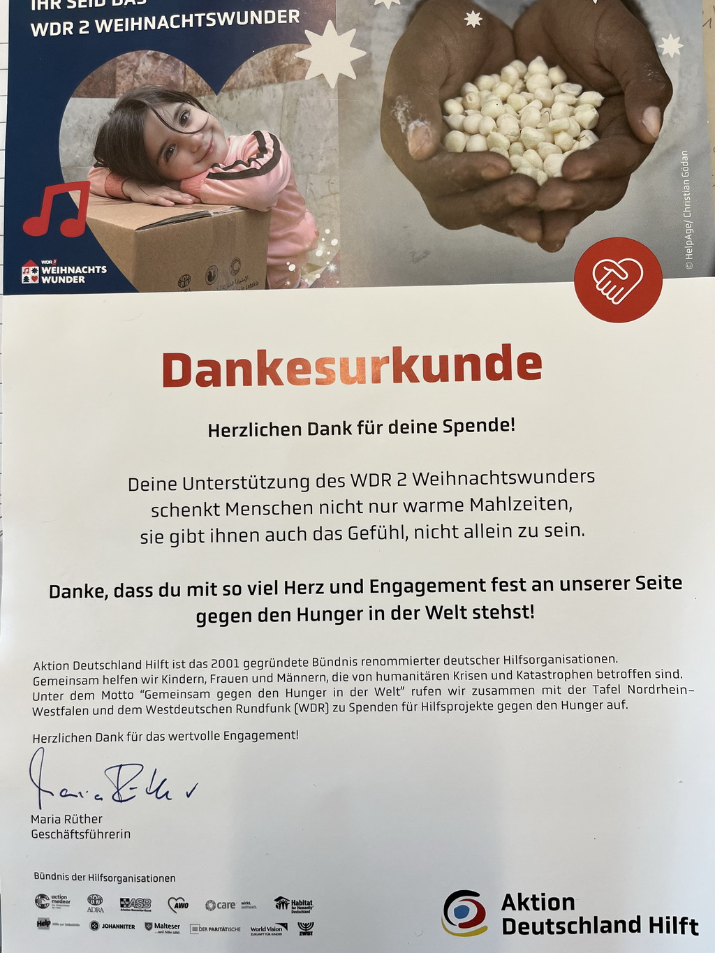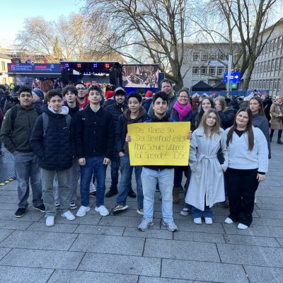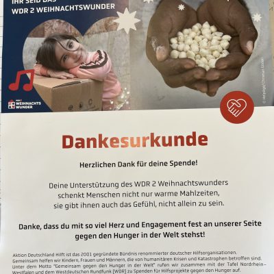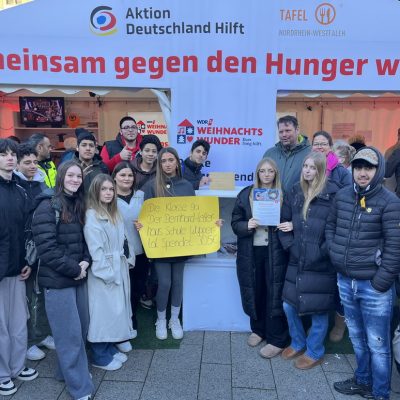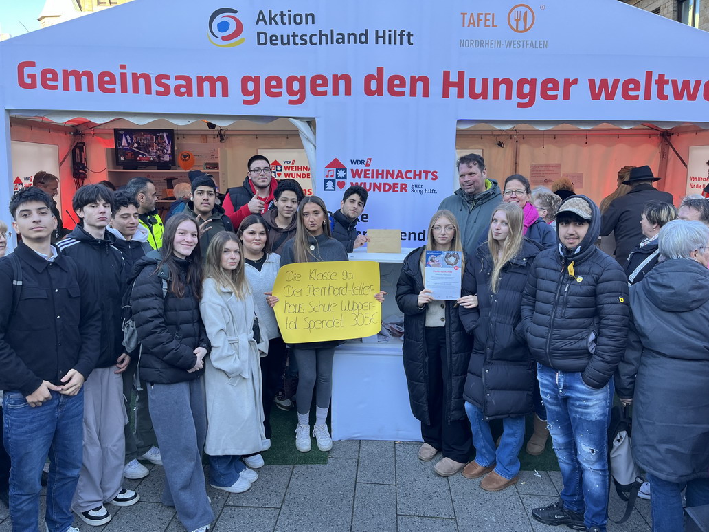 Am 13.12.2025 ging es für die 9a nach Essen zum WDR 2 Weihnachtswunder. Die Einnahmen und Spenden vom Frühstückskiosk am 4.12 und 11.12 gingen zu 100% an das Weihnachtswunder 2025. Die Klasse konnte einen Umschlag mit 305,- überreichen.